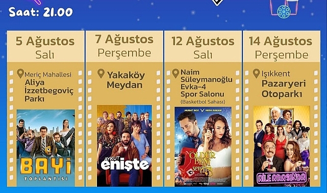 10 mahalle, 10 film, sayısız gülümsemeBornova Belediyesi’nin 17 Temmuz’da Büyükpark’ta başlattığı Yaz Açıkhava Sinema Günleri, mahallelerde sinema keyfini nostaljiyle buluşturuyor. Gazoz ve patlamış mısır ikramıyla şenlenen etkinlik, 14 Ağustos’ta Işıkkent’te gerçekleşecek finalle sona erecek.Bornovalıların her yaz dört gözle beklediği Açıkhava Sinema Günleri, bu yıl da yoğun ilgi görüyor. Etkinlik, 17 Temmuz’da Büyükpark’ta gösterilen “Kolonya Cumhuriyeti” filmiyle başladı. Ardından her hafta iki farklı mahallede dev perdede Türk sinemasının sevilen komedileri izleyiciyle buluştu:Pınarbaşı – Hedefim SensinÇamkule – DörtnalaEğridere – GörümceÇamdibi – Bursa BülbülüMevlana – HokkabazMeriç – Bayi Toplantısı Açıkhava sinema serüveni, 7 Ağustos Perşembe günü Yakaköy’de gösterilecek “Aykut Enişte”, 12 Ağustos Salı günü EVKA-4’teki “Öldür Beni Sevgilim” ve 14 Ağustos Perşembe günü Işıkkent’teki “Aile Arasında” filmiyle sona erecek.Her mahallede nostalji, her akşamda kahkahaGazoz ve patlamış mısır ikramıyla renklenen etkinlikte, mahalle sakinleri yaz akşamlarının tadını açık havada birlikte sinema izleyerek çıkarıyor. Her yaştan Bornovalı’nın bir araya geldiği organizasyon, hem nostaljik bir atmosfer yaratıyor hem de mahalleler arasında sosyal dayanışmayı pekiştiriyor.Başkan Eşki: “Bornova’da yazın keyfi birlikte çıkıyor”Bornova Belediye Başkanı Ömer Eşki, etkinliğe gösterilen ilgiden memnuniyet duyduğunu belirterek, “Açıkhava Sinema Günleri, sadece film izlemek değil; komşuların bir araya geldiği, çocukların güldüğü, ailelerin birlikte zaman geçirdiği bir sosyal dayanışma projesidir. Mahalle mahalle gezerek bu güzel birlikteliği paylaşmak bizi çok mutlu ediyor. Bornova’da yazın keyfi birlikte çıkıyor.” diye konuştu.