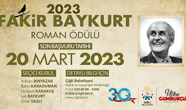 Çiğli Belediyesi tarafından, edebiyatın insana kazandırdığı değerleri çoğaltmak amacıyla dört yıldır düzenlenen Fakir Baykurt Roman Ödülü’nün 2023 yılı duyurusu yapıldı. Roman Ödülü’ne katılmak isteyenler 20 Mart 2023 tarihine kadar dosyalarını gönderilebilecek.