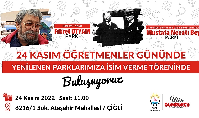 Çiğli Belediyesi, 24 Kasım Öğretmenler Günü kapsamında yenileme çalışmalarını tamamladığı parklar için İsim Verme Töreni düzenleyecek. Cumhuriyet dönemi Milli Eğitim Bakanlarından Mustafa Necati Bey ve fotoğrafçı-yazar Fikret Otyam’ın isimleri Çiğli’de ölümsüzleştirilecek.