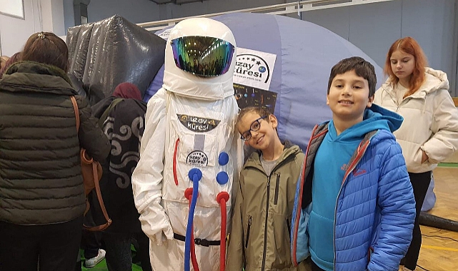 Astronot kıyafetli öğreticilerin karşıladığı çocuklar, Uzay Küresinin içinde yansıtılan gezegenlerin, yıldızların ve diğer gök cisimlerinin görüntülerini büyük hayranlıkla izledi.