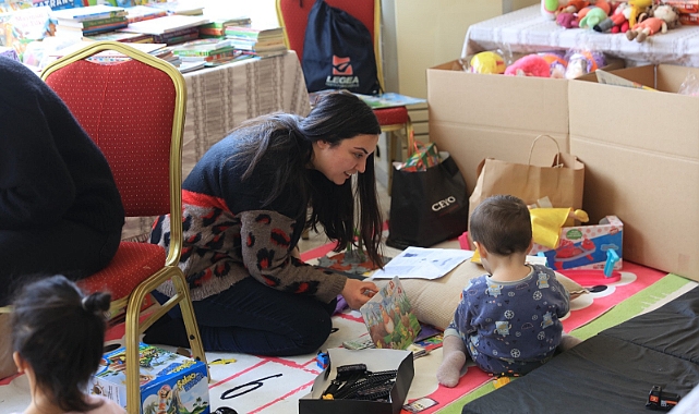 Kahramanmaraş merkezli 10 ili etkileyen depremler sonrasında İzmir’e gelen depremzede ailelerin Güzelbahçe Yardım Merkezine gelen ailelerin çocukları için çocuk oyun alanı oluşturuldu.